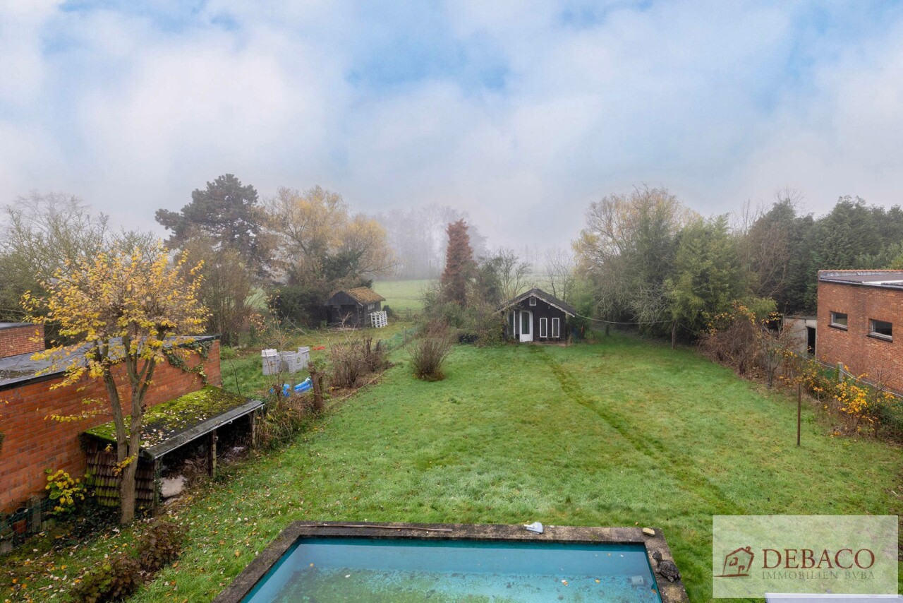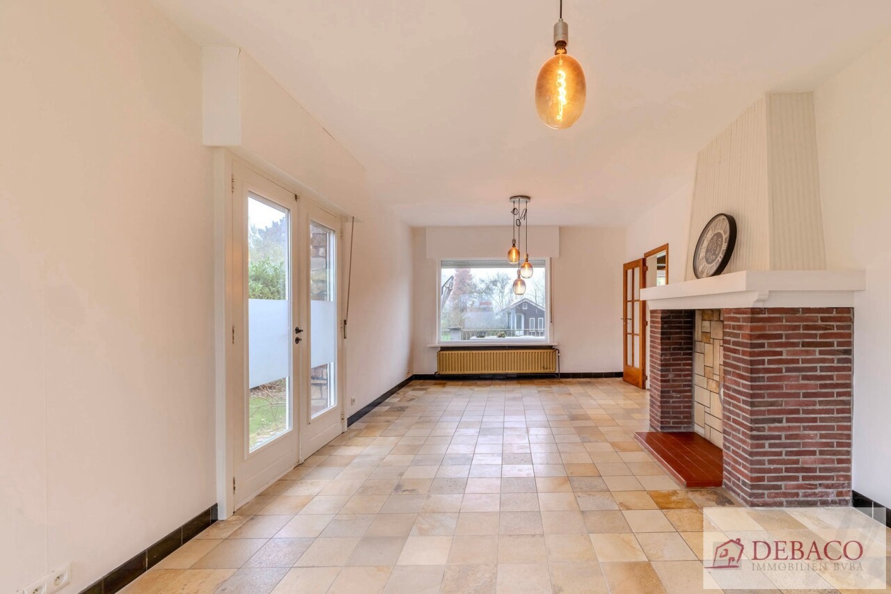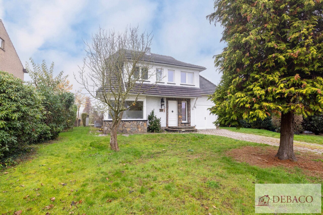 Deze charmante woning bestaat uit een ruime inkomhal, woonkamer, keuken, drie slaapkamers, twee badkamers, kelder, garage, terras en tuin met vijver en tuinhuis.