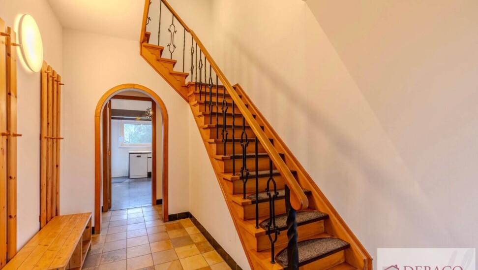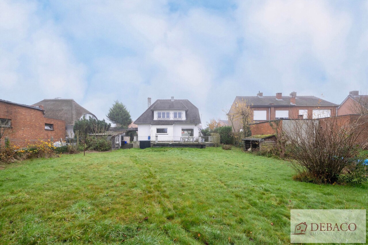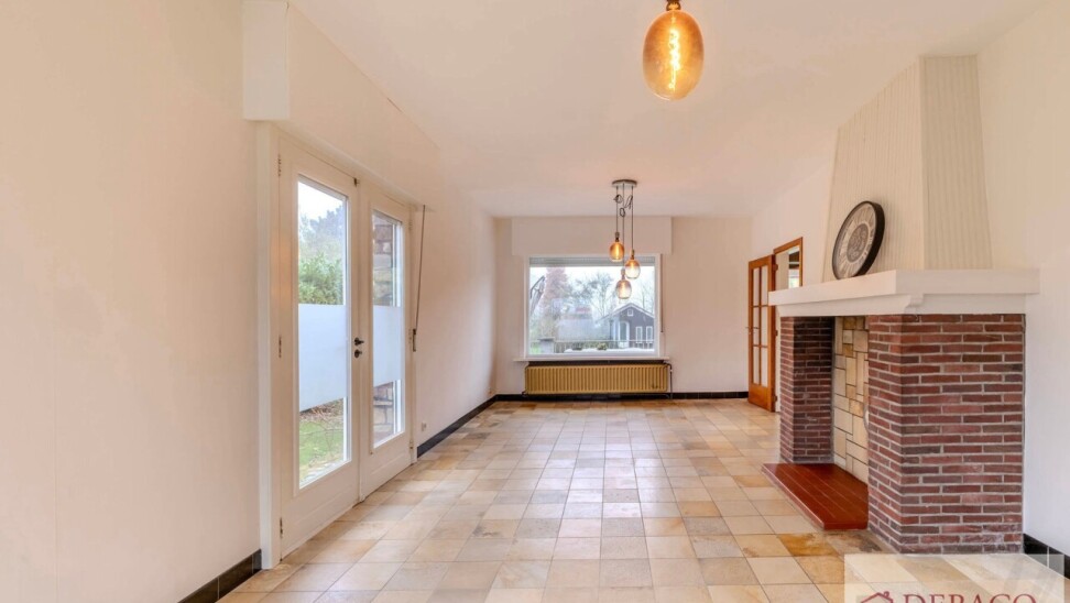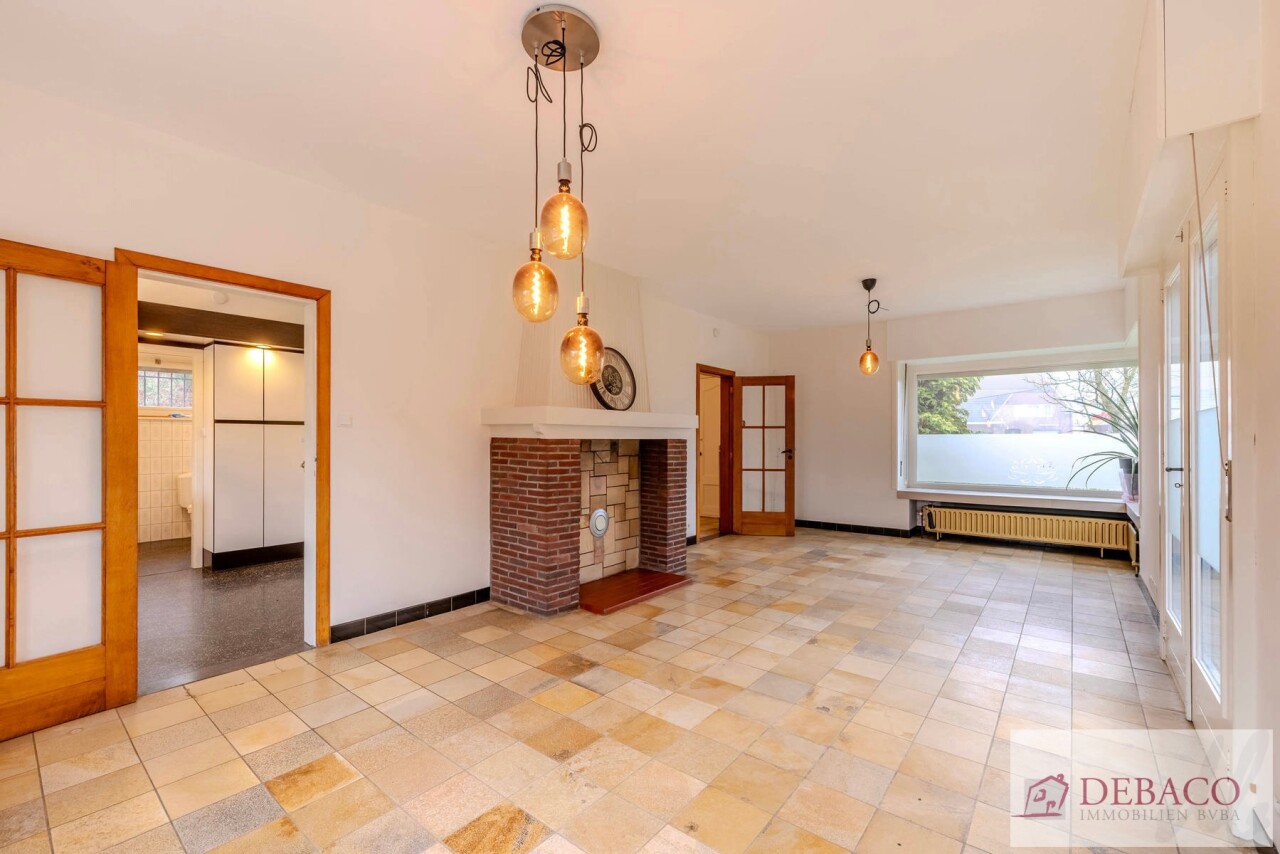 Deze charmante woning bestaat uit een ruime inkomhal, woonkamer, keuken, drie slaapkamers, twee badkamers, kelder, garage, terras en tuin met vijver en tuinhuis.