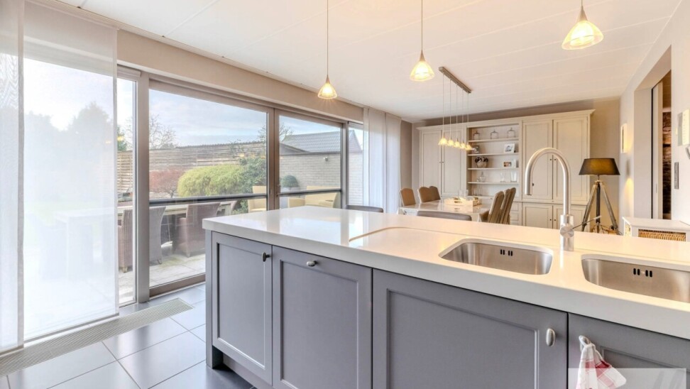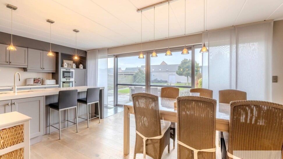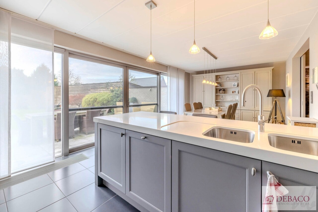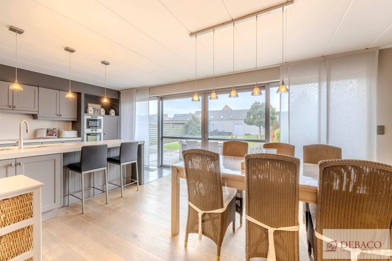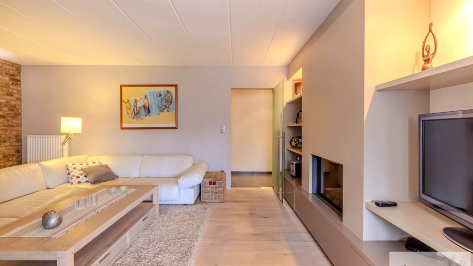 Binnenin wordt u verwelkomd in de inkomhal welke uitgeeft op de prachtige aangename leefruimte die voorzien is van een parketvloer. In deze leefruimte is er ook nog een gashaard en een bureau aanwezig. Vanuit de leefruimte krijgt u toegang tot de eetruimte en een aansluitende volledig uitgeruste keuken. Deze ruimte geniet van veel natuurlijke lichtinval en van een prachtig uitzicht op de tuin.