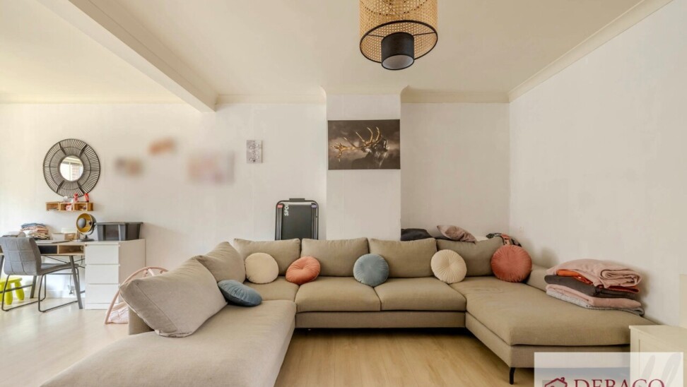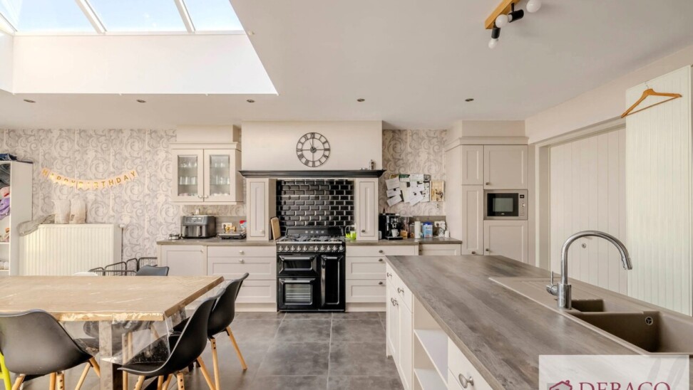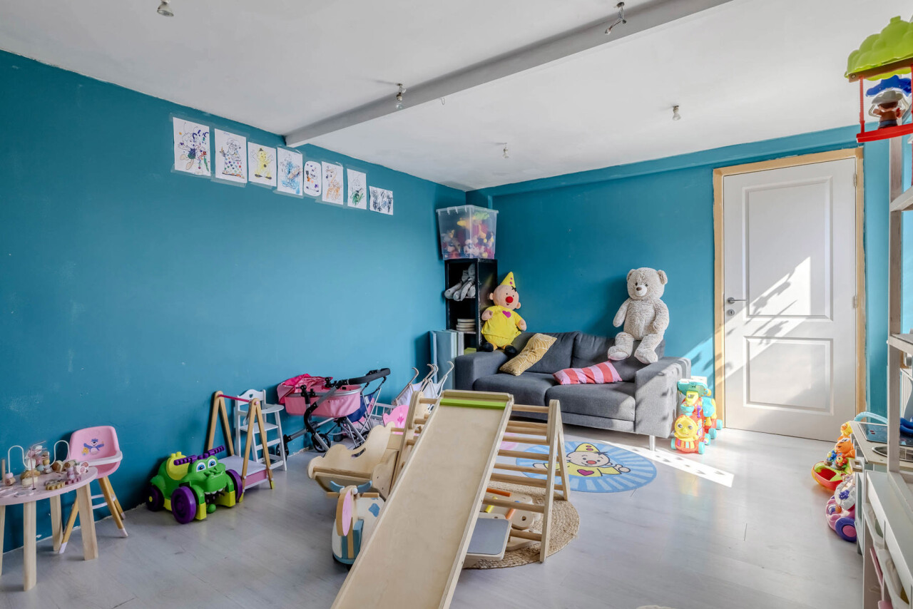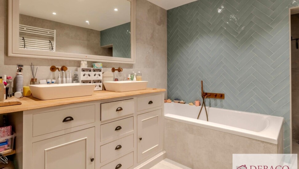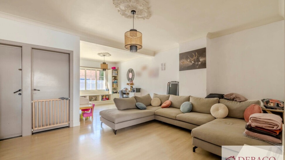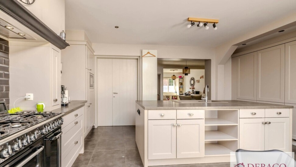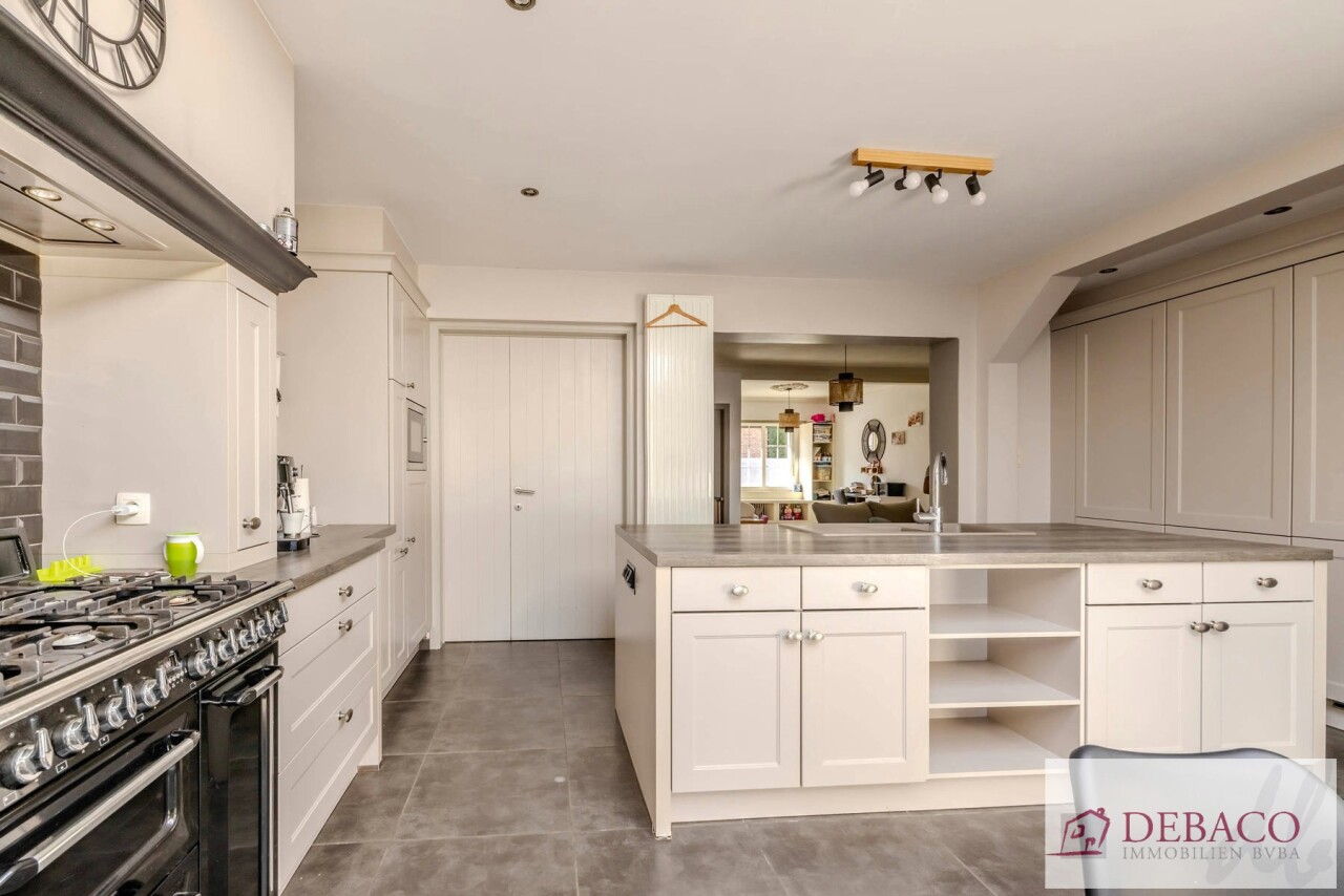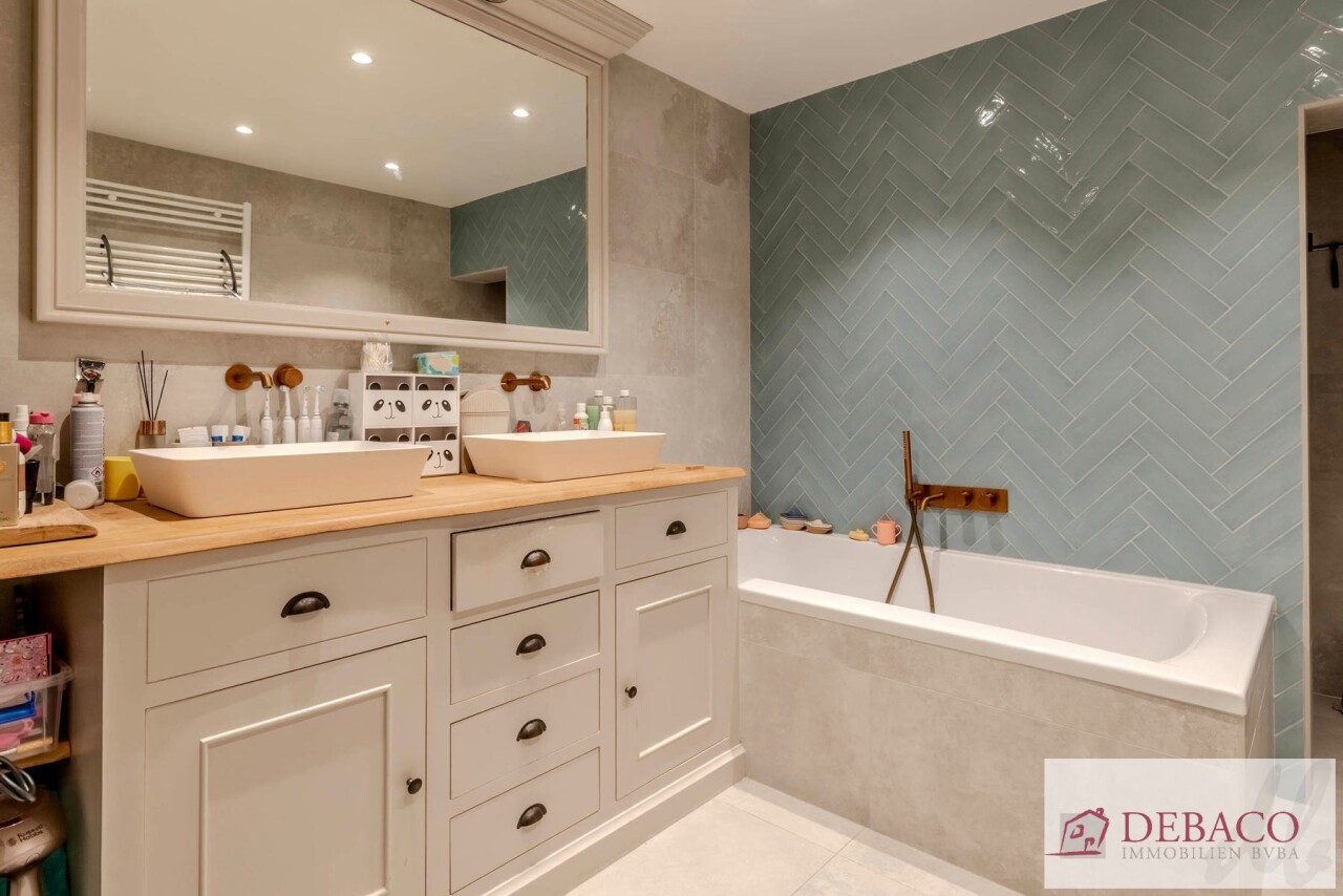 Bestaat op het gelijkvloers uit inkomhal, ruime woonkamer, prachtige ingerichte (luxe) keuken met aansluitende eetplaats, aparte berging, speel- of bureauruimte (eventueel gelijkvloerse slaapkamer), luxe badkamer, wasruimte/berging en kelder. De naastgelegen aanpalende garage is een ideale plaats voor berging fietsen en stockageruimte.