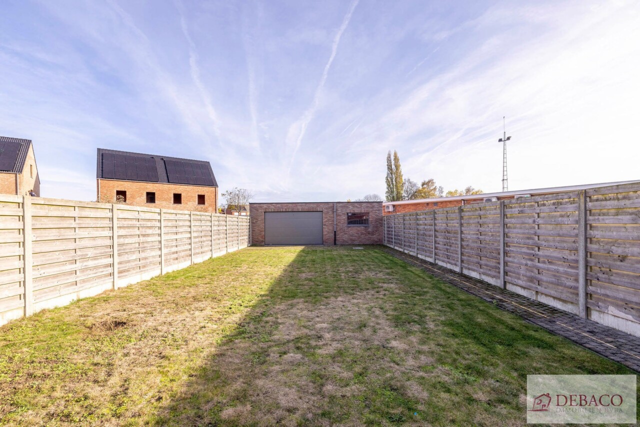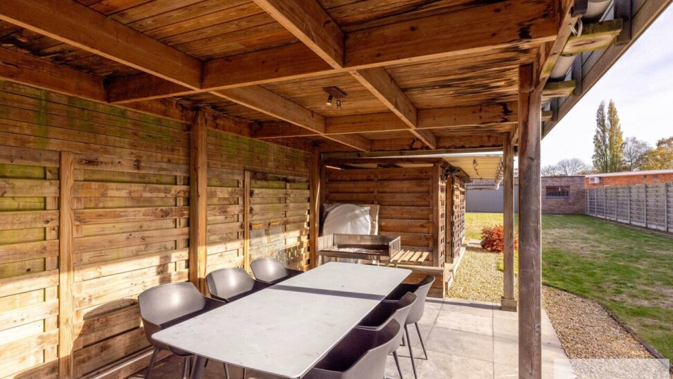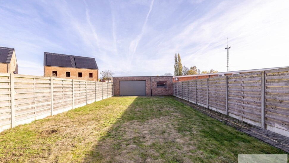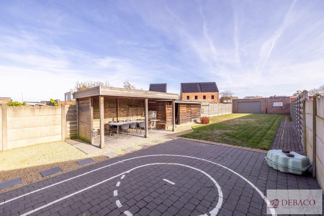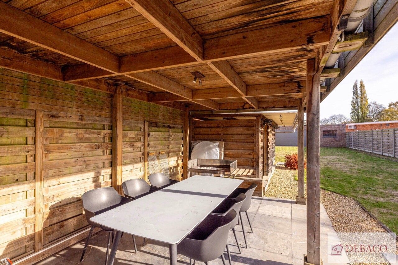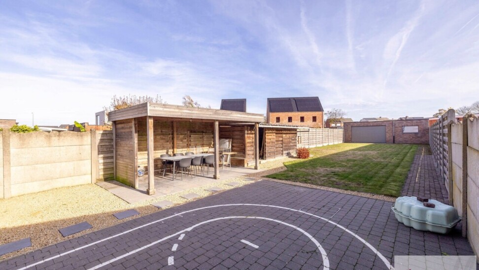 Ten slotte is er nog een heel aangename tuin aanwezig met een overdekte lounge en een tuinberging. Helemaal achteraan de tuin vindt u nog een praktische garage met een automatische poort, deze garage kan perfect dienen als werkplaats of extra bergruimte.