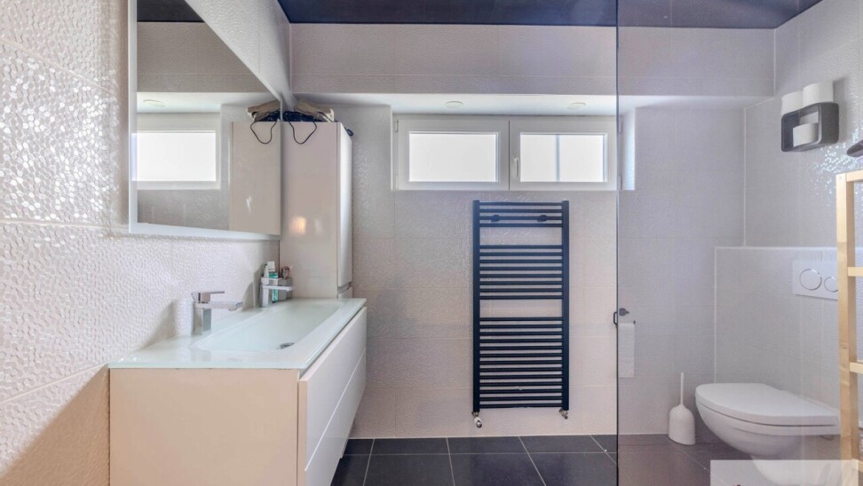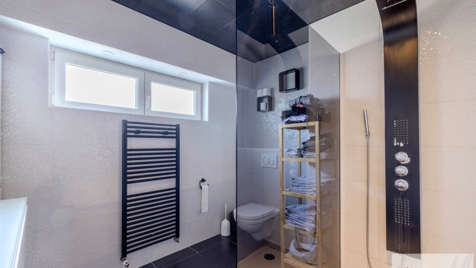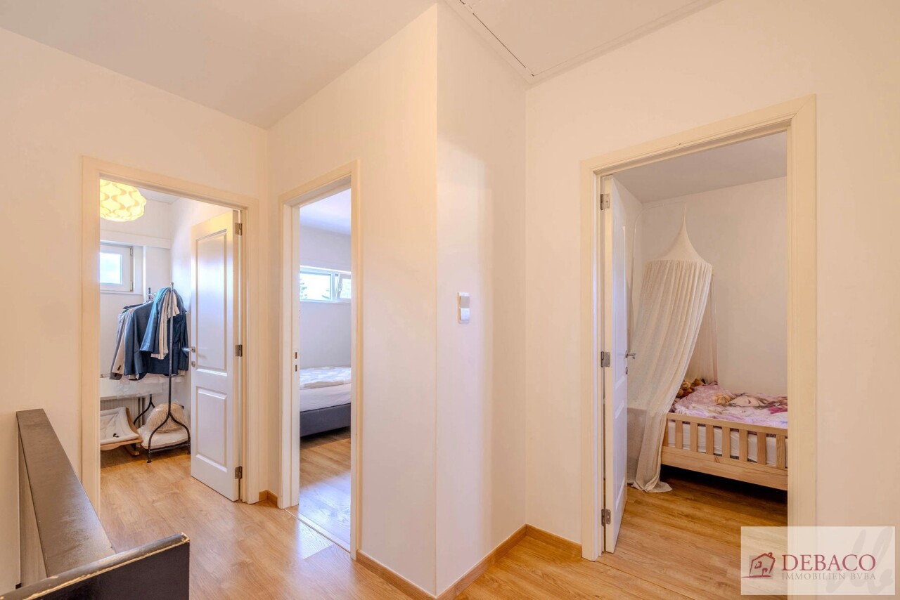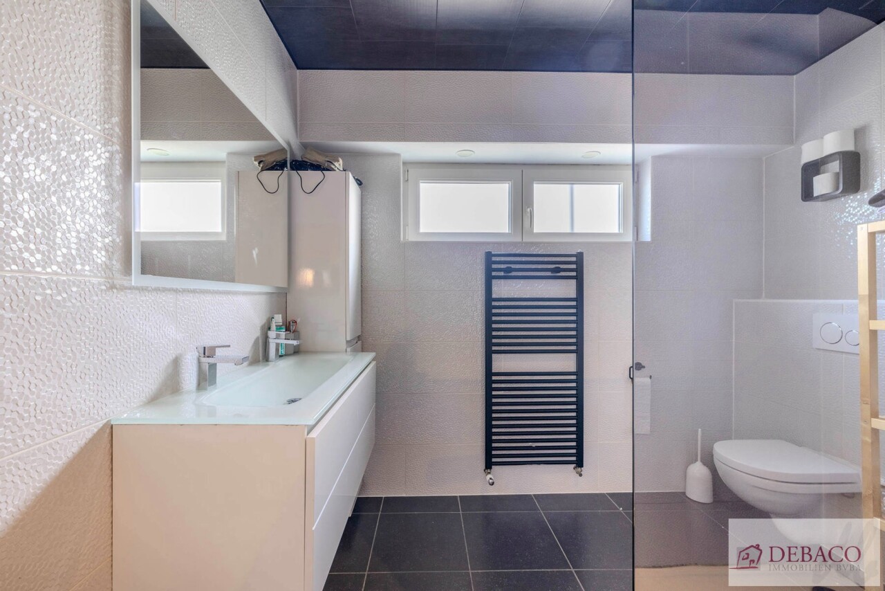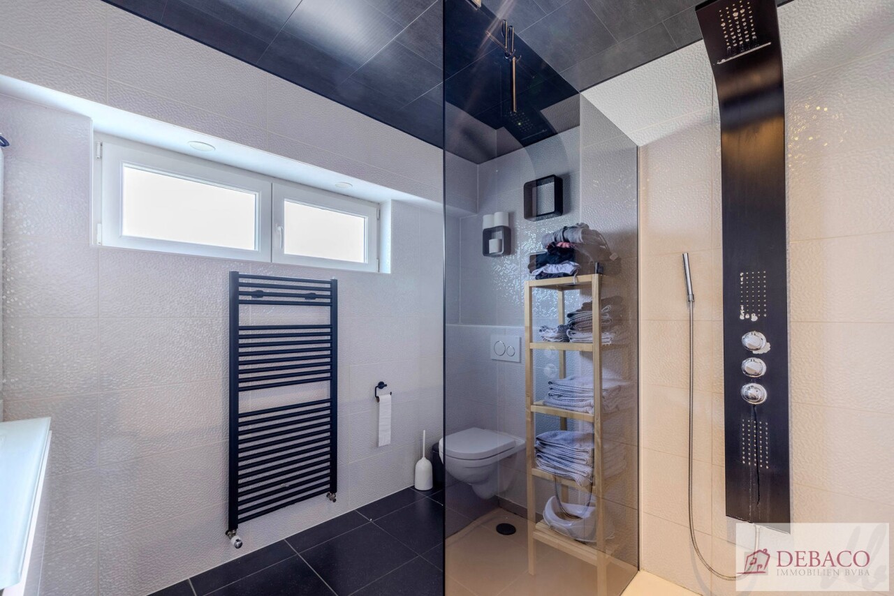 Op de eerste verdieping bevinden zich twee mooie slaapkamer en een prachtige geïnstalleerde badkamer met een ruime inloopdouche, lavabo en toilet.