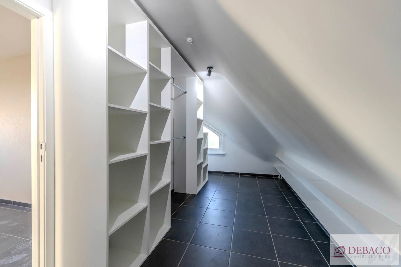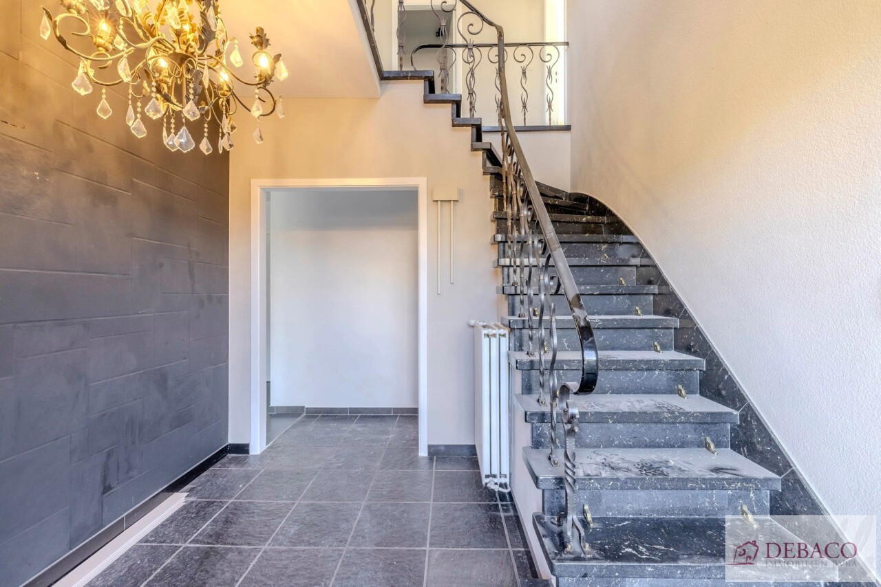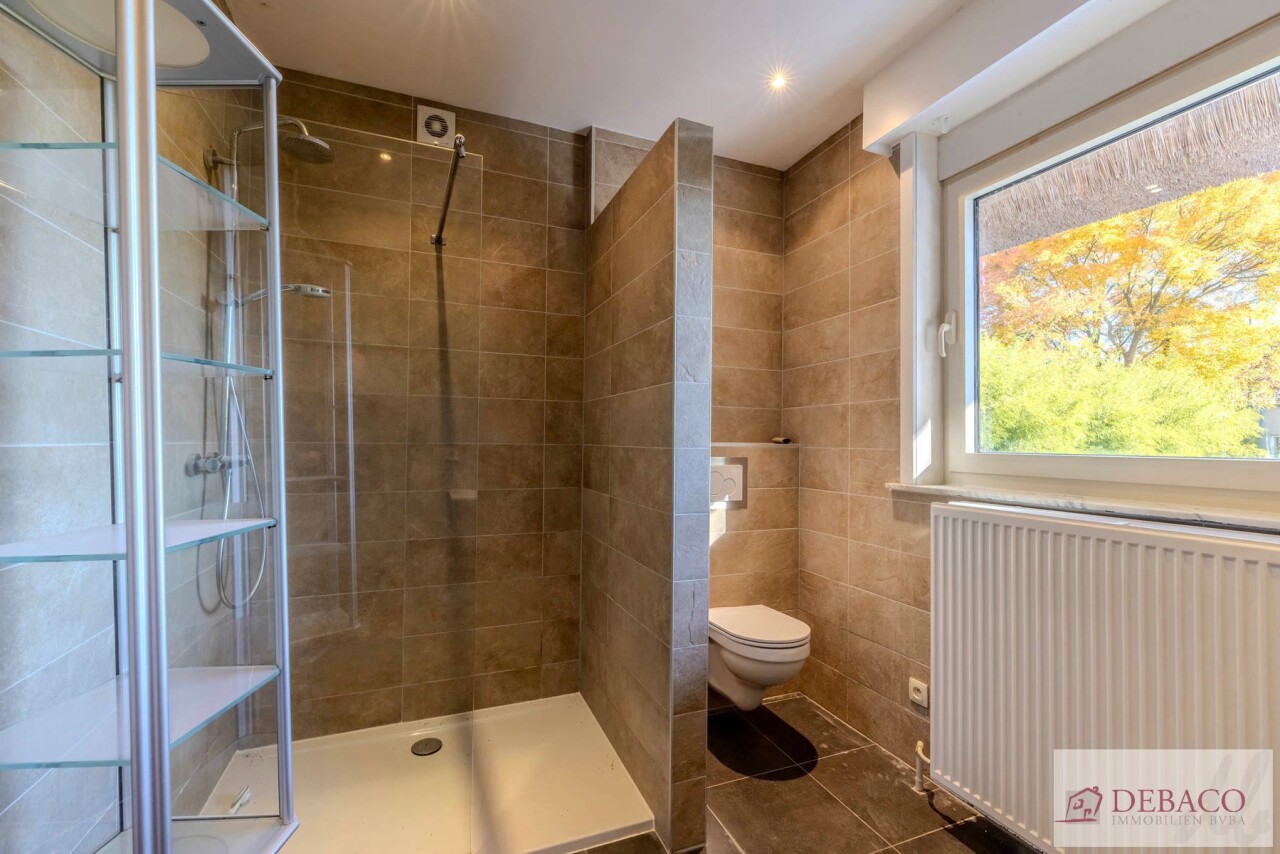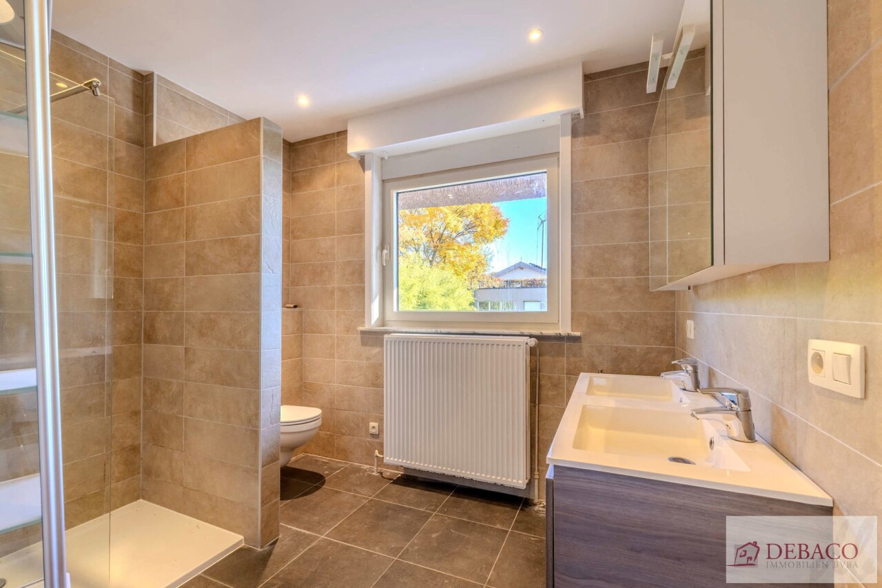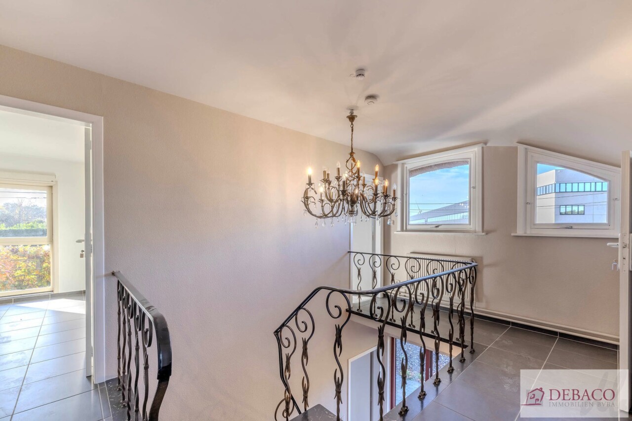 Deze woning bestaat uit een ravissante inkomhal met gastentoilet, woonkamer, volledig ingerichte keuken, badkamer (voorzien van douche, toilet en dubbele wastafel), berging/wasplaats, bureauruimte (of vijfde slaapkamer), kelder, vier slaapkamers, berging, voor- en achtertuin, terras en zeer ruime garage. De garage is toegankelijk via een aparte toegang achteraan de woning via de naastliggende straat.